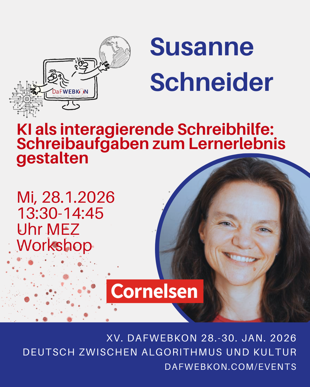 Dass das im Zeitalter der KI nicht so sein muss und wieviel Spaß und Sinn es macht, selbst zu schreiben, entdecken wir in diesem Webinar. Kernpunkte sind der Fokus auf den Schreibprozess, statt auf das Schreibergebnis sowie ein Verständnis von KI als interagierende begleitende Schreibhilfe, die Impulse, Hinweise und konstruktives Feedback gibt. Erfahren Sie, wie Sie sich und Ihren Lernenden aller Niveaustufen (wieder) Lust aufs Schreiben machen!