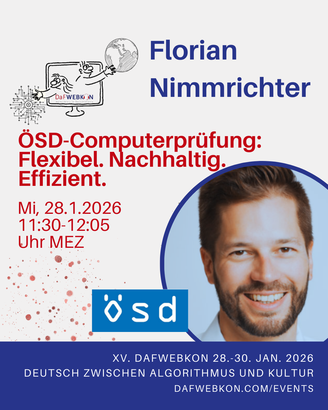 Florian NimmriichterMitarbeiter ÖSDFlorian Nimmrichter, Bakk. phil., ist seit über 10 Jahren Mitarbeiter des ÖSD. Aktuell arbeitet er vor allem bei der Entwicklung und Umsetzung der digitalen ÖSD-Prüfungen mit. Daneben betreut die Anträge von Teilnehmenden mit spezifischen Bedürfnissen und als Teil der Abteilung Marketing kümmert er sich um die neuen Lizenzwerber. Florian Nimmrichter kann auf gut 20 Jahre an Erfahrungen als Lektor für DaF/DaZ zurückblicken.