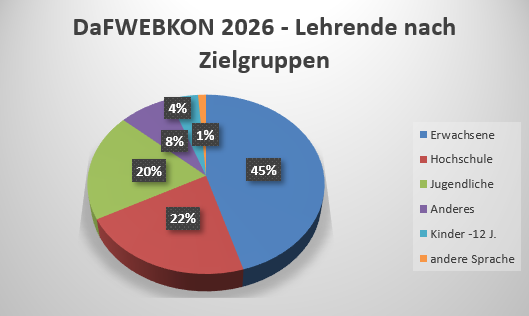 Das Publikum setzte sich aus Deutsch als Fremd/Zweitsprache-Lehrenden primär mit der Zielgruppe Erwachsene sowie Studierende an Universitäten und Hochschulen sowie Jugendlichen zwischen 13 und 18 Jahren zusammen.